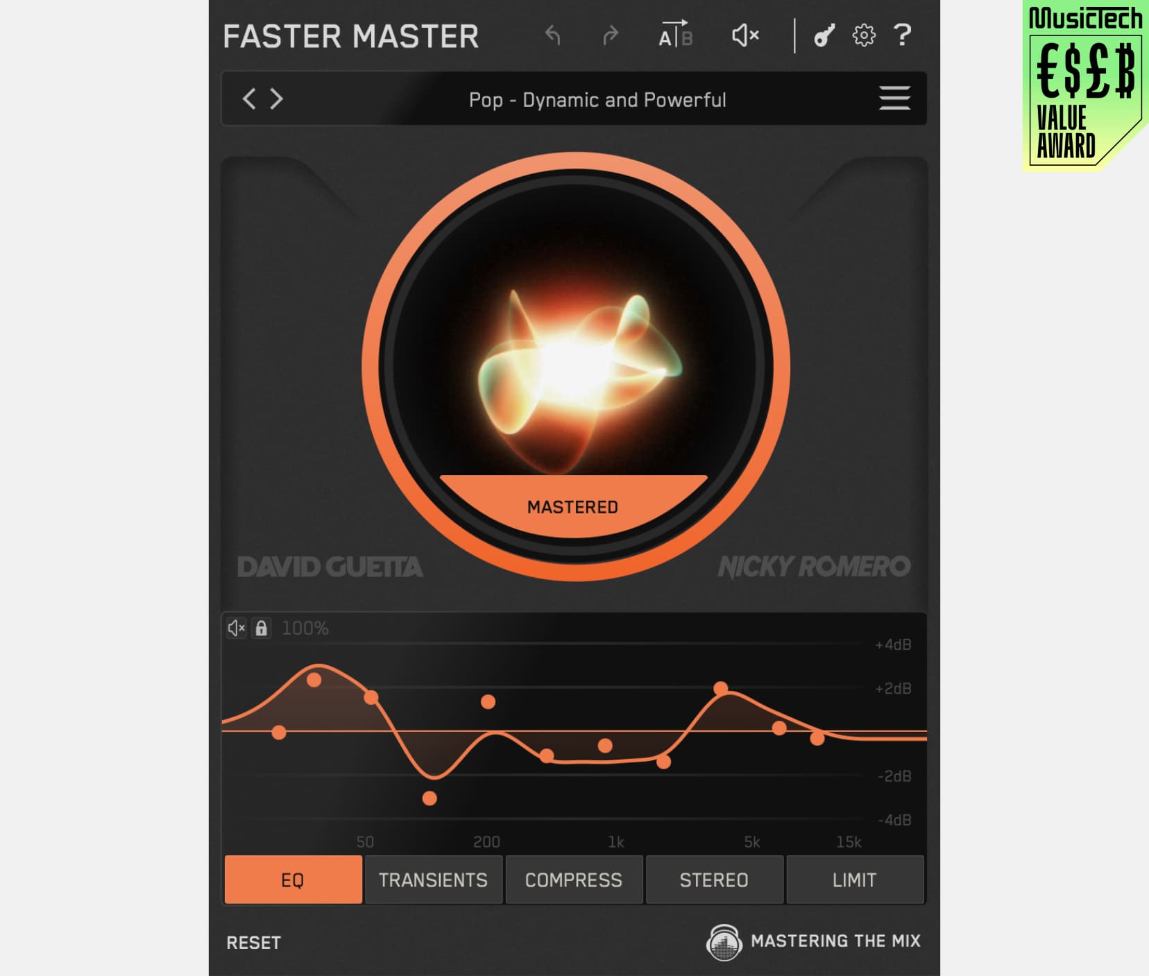 - Choose from 10 smart presets, fine-tune EQ, transients, compression, stereo width, and limiting with intuitive controls.