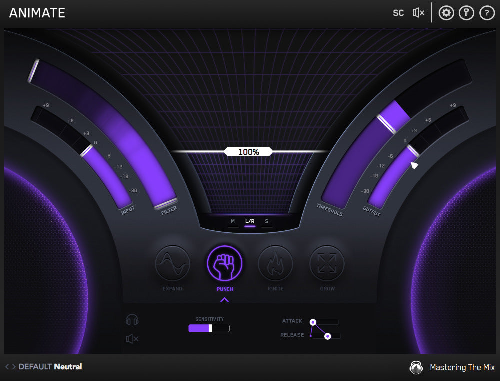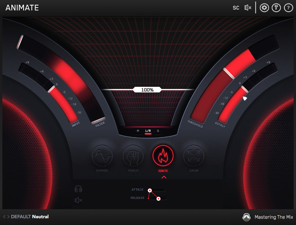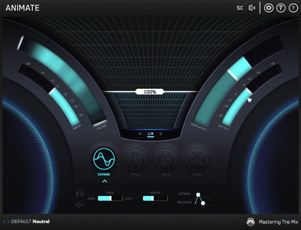If you want the selected effect to process the entire stereo spread of the audio coming through ANIMATE leave the default ‘L/R’ button engaged. If you want the selected effect to only process the mid signal, click ‘M’. If you want the selected effect to only process the side signal, click ‘S’.