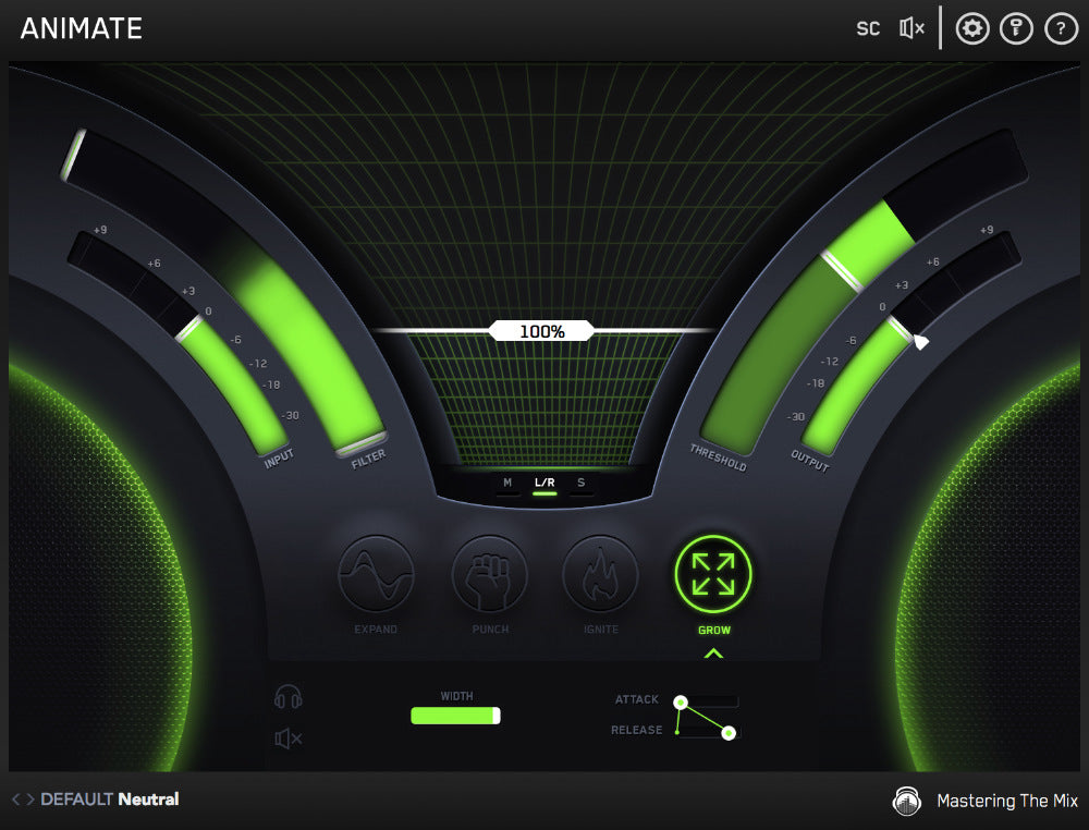 Grow mode lets you increase the width of the selected frequencies using a psychoacoustic precedence effect. Grow can be applied in a dynamic way meaning only the signal surpassing the threshold is widened. This along with the frequency selection gives you a new realm of movement to inject into your music.