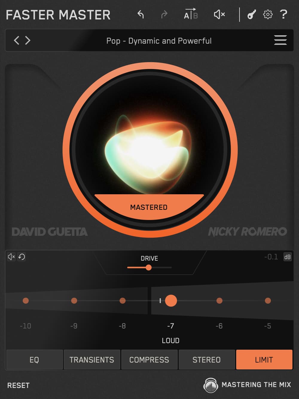 FASTER MASTER gives you optimized limiter settings tailored to your unique song. All you need to do is set your preferred maximum loudness.
