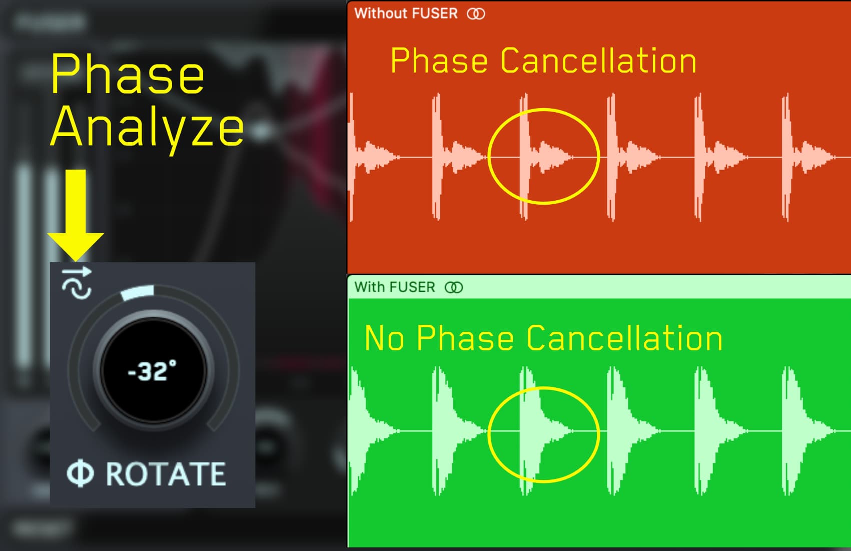 Need to reduce phase cancellation and make your layered sounds shine? FUSER has you covered. The innovative Phase Analyze feature automatically finds the optimal phase rotation ensuring minimal phase cancellation when layering similar sounds such as kicks and basses. Once you hear the breathtaking results, you’ll never layer sounds without FUSER again.
