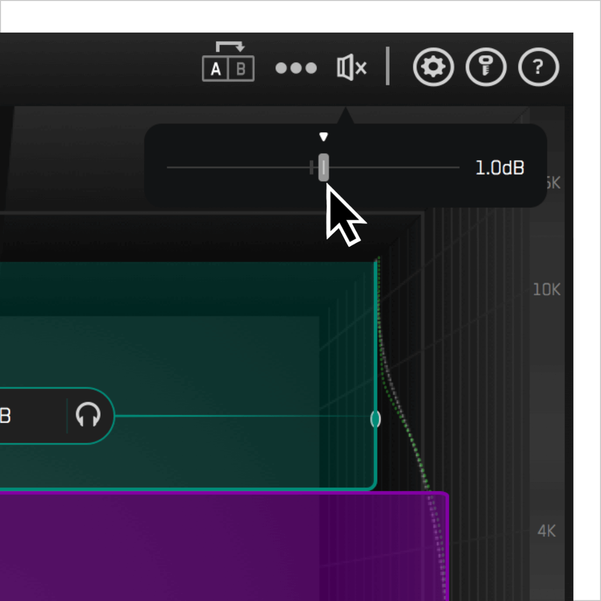 Each band has full mid/side capabilities allowing you to shape the balance of your stereo spread. Using mid-side processing is particularly useful for when you want to adjust the gain of a particular frequency in a specific stereo position. Hover your mouse over an EQ band’s control panel and click the M for mid, S for side, and the stereo icon for stereo. Click and drag the stereo icon left and right to set a perfect blend of mid/side.